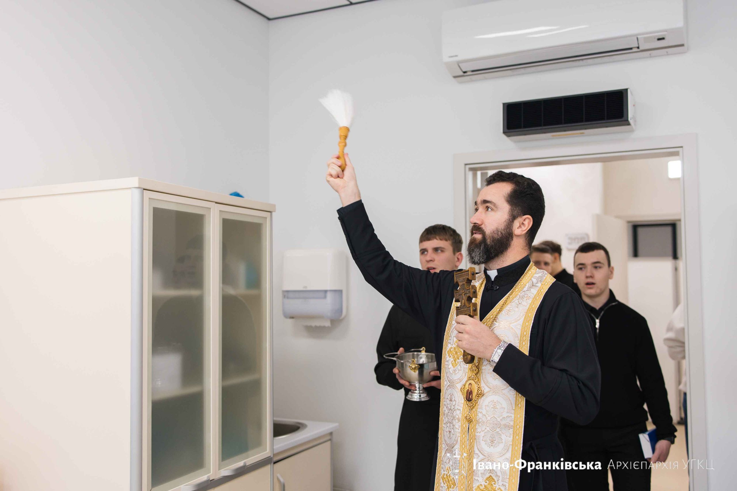 Відтак Владика Микола у супроводі семінаристів завітав у різні приміщення клініки, благословляючи Йорданською водою медиків та пацієнтів на щасливий 2026 рік Божий та міцне здоров’я для кожного з них.